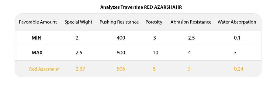 Red Azarshahr travertine is one of the most unique type of stone in world with special place in global markets in both processed & rock shapes. It can be sawn in vein cut & cross cut shapes in tile & slab dimensions. It is highly heat, cold & slippery resistant & its high pressure resistance makes it to be easily rubbed. Therefore, it is suitable for every possible parts of a building such as facades, interior spaces & pavers. Also it is highly can be used for decorative objects & finishes such as statues, guillotine & so on.