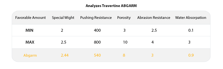 Abgarm travertine has gained a special place in global markets recently. It has variegated colors, free from cream, beige & even olive-cream discoloration. The standard grades of Abgarm travertine have very tiny pores which in this respect are very similar to Hajiabad travertine, despite, the lower grades have much bigger pores in their structure. Abgarm premium or first grade is suitable for the main facades of the building as well as roman structures.